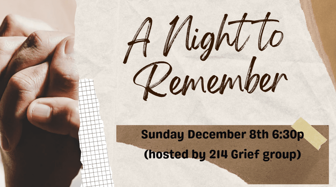 You are not alone! Grief can be especially difficult and real during the holidays. December 8th at 6:30pm you are invited to share in A Night to Remember hosted by our 214 Grief Ministry, Terri Mullins, and Dave Colbert. You can expect a great meal, companionship and a listening ear as well as encouraging scripture, music, and the opportunity to light a candle and pray. We encourage you to bring a small framed picture representing your grief and a heart open to encouragement.